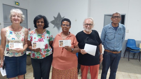 Réunion, apogée de la saison Scrabblesque locale. Le samedi, en 2 parties tirées par Bernadette Ollivier, secrétaire de la Ligue : Championnats de la Réunion par paires Les championnes sont (au centre) France Line Néoclés et Monique Atchy, indiscutablement les 2 meilleures joueuses de l’île. Belle 2e place des Saint-Pauloises Marie-Claire Mallard et Myrianne Séverin-Rancé (à gauche) 3ème, l’indissociable paire Tamponnaise : France Boulanger et Jean-Claude Guillot. 2 atscafiens participant mais pas de vraie paire "Atscaf" pour ce tournoi ! |