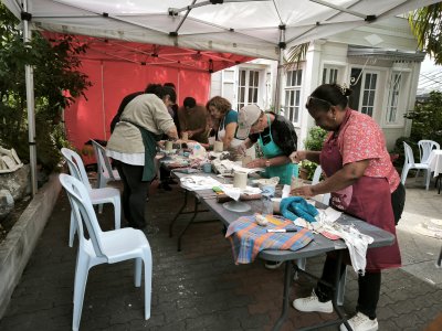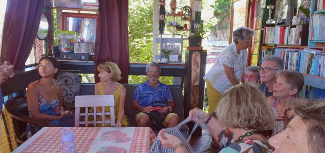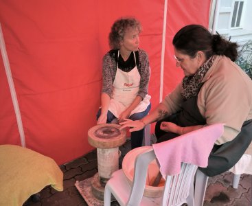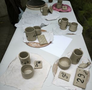 | Ce samedi 2 août 2025, nous sommes 7 atscafiens reçu par Mira et son papa pour une journée instance d'initiation à la poterie... Tournage, barbotine, colombin, etc... Plein de nouveaux termes et méthodes pour la création de 3 pièces par participant. 7 élèves appliqués à la personnalisation de leurs créations !A midi, partage d'un repas avec nos hôtes à l'auberge espagnole. | |