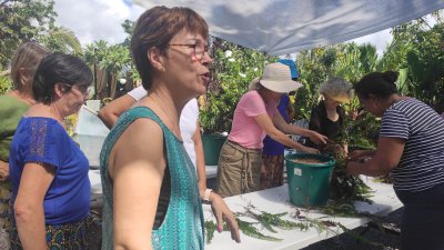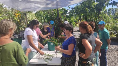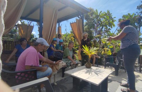 | Ce samedi, 11 atscafiens se sont retrouvés à Saint André pour participer à un atelier kokédama (art floral japonais qui utilise des sphères de mousse sur lesquelles s'épanouissent des plantes) . Accueil très chaleureux de notre animatrice Corinne Techer : café, thé, eau fraiche, jus de fruits accompagné de petits gâteaux. Visite de l'immense jardin qui a enchanté tous les participants. Visite de la case Floria2. Puis atelier et chacun s'est investi pour réaliser ses propres kokedama avec l'aide précieuse de Corinne. S'en est suivi un excellent repas préparé par J-Bernard, l'homme de la case, terminé par un gâteau tison maison du tonnerre ... tout le monde est reparti ravi... | |