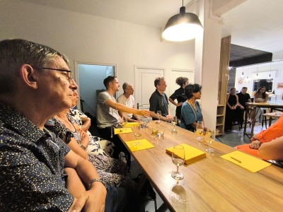 organisé par Enfin! Le fromager à Saint Denis. Françoise une participante a résumé très justement cette soirée : " Une belle découverte pour moi qui n'osais jamais entrer dans les fromageries parce que c'est cher... Oui mais quelles saveurs incomparables! Le Gouda, les tommes aux fleurs ou au Pinot noir, le cheddar au café...Le risotto au....je sais plus....le Prosecco me fait oublier le reste....J'y retournerai très certainement très vite". |