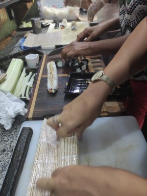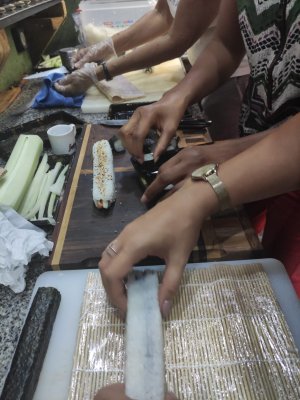 fabrication des sushis. : Il a été très agréable de pouvoir se retrouver suite à cette période anxiogène contraignant à l'isolement, rencontrer des adhérents que l'on ne connaissait pas encore, échanger entre eux et avec le formateur. |