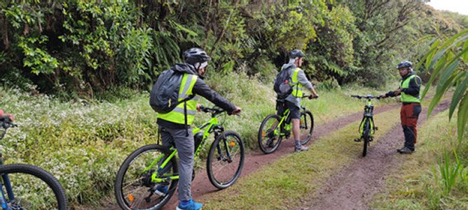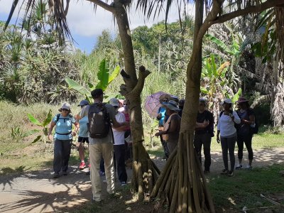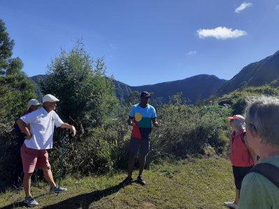 à Dos d'âne en compagnie de Clovis Etchiandas le guide et William Silotia le tisaneur ... Une découverte des plantes médicinales et des tisanes lors d'une balade guidée jusqu'au magnifique point de vue de Cap Noir sur le cirque de Mafate. Bois maigre , liane patte poule piquante, fraises de l'eau, onagre locale , gingembre sauvage ou bois de rempart ont imagé les propos de William qui , sur quelques centaines de mètres, nous a communiqué sa passion des plantes ! Nous nous sommes ensuite rendus au snack "le Ben île" pour un repas bien apprécié par les 10 atscafiens présents ! |