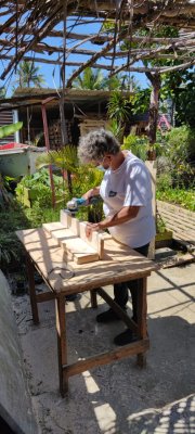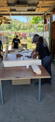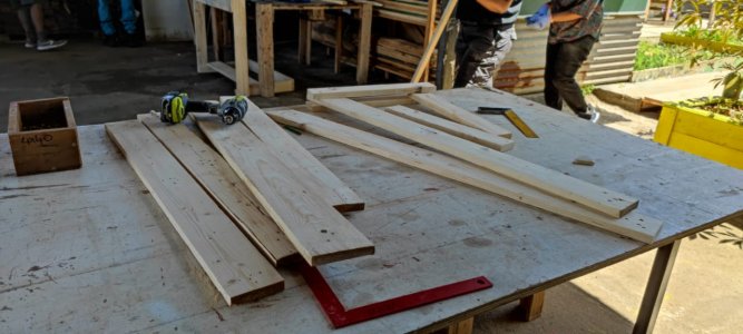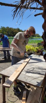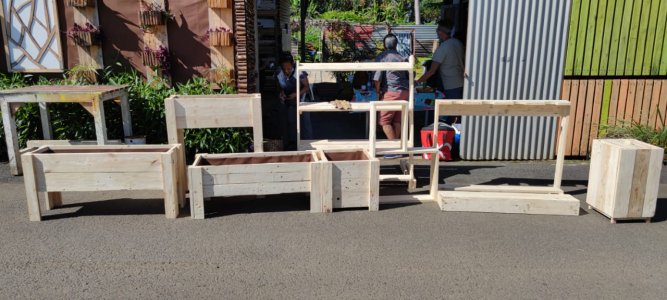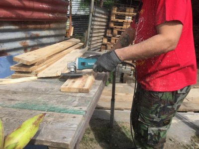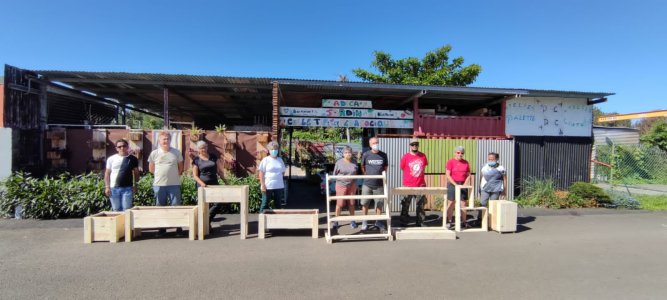 | Samedi 16 octobre 2021, atelier palette à Saint André avec l'association ADICA : démarrage 8h00 avec le démontage des palettes (assez physique avec l'utilisation du pied de biche), 10h00 pause café gâteau puis ponçage des planches (on se fatigue encore un peu ...) les animateurs coupent les planches aux dimensions requises. Puis repas en commun et enfin chacun réalise l'assemblage avec la visseuse sur les conseils des animateurs ... A 15h30 on peut donc photographier les 9 participants et leurs 8 réalisations ! | ||