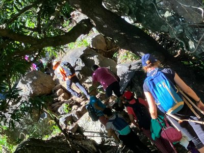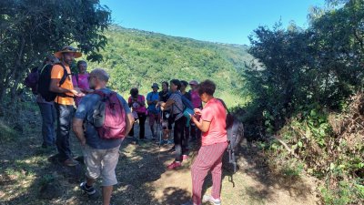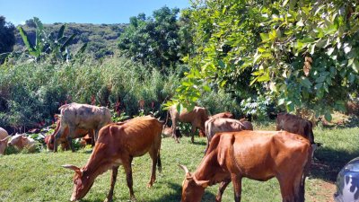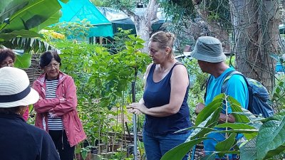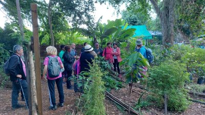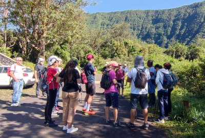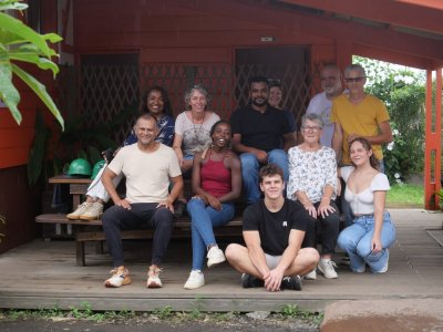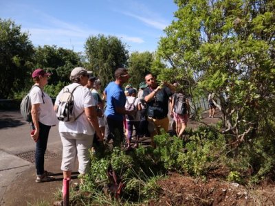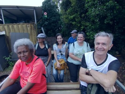 | Samedi 3 juin, nous nous sommes retrouvés à 12 atscafiens à 7 heures au bassin Vital pour une visite randonnée en compagnie de Mathieu de l'office du Tourisme de l'Ouest . La matinée a démarré par un petit déjeuner avec les responsables de l'association" les jardins de fond imar" (gâteau,beignet, tisane ...) suivi d'une visite du jardin "la boutique enragée : Coralie Hoarau nous a fait redécouvrir les savoir-faire locaux et l’expérimentation de la biodynamie en milieu tropical. (L'objectif de la biodynamie est d'offrir à l'être humain une nourriture cultivée le plus sainement possible et dans le plus grand respect de l'environnement)... Puis le groupe a amorcé la randonnée en direction du bassin Vital ; Petite pause Mathieu nous raconte la légende de deux amoureux saint-paulois puis le groupe continue la boucle pour redecendre au point de départ par le chemin Emile ... Et profiter d'un bon déjeuner créole dans feuille banane ( fruit à pain accompagné de gros pois citrouille, zourite et cabri massalé avec en dessert gâteau fruit à pain accompagné de gelée bissap et pamplemousse confit ! | |