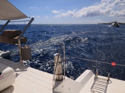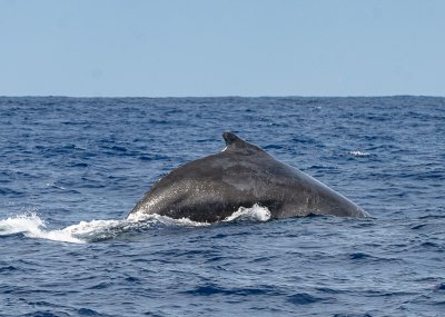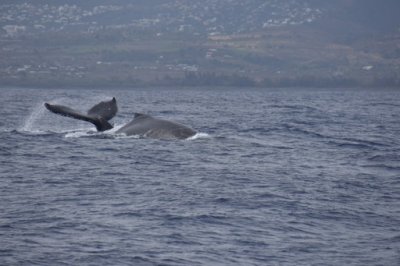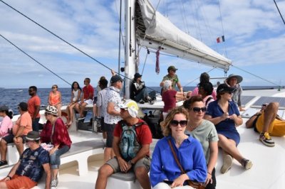 | Ce samedi 6 août, une sortie "observation des baleines" est organisée. 50 adhérents ont pris place dans le catamaran "Le Maloya" pour une sortie en mer de 2h30. Au large de la rade du Port, nous avons pu observer de nombreuses baleines et quelques dauphins. Le beau temps était au rendez-vous, le vent et la houle aussi. | |