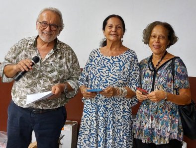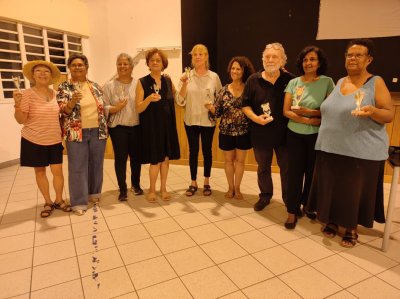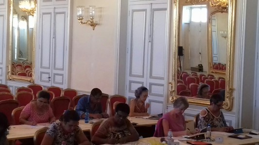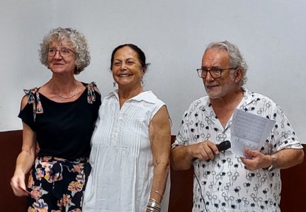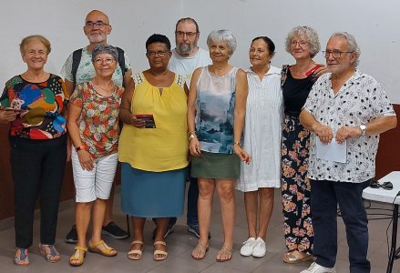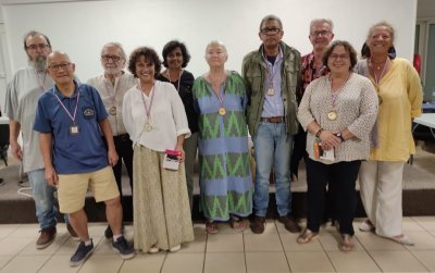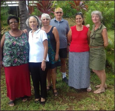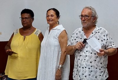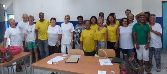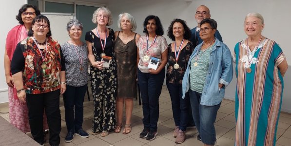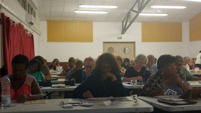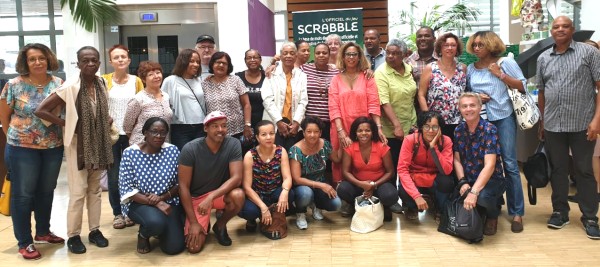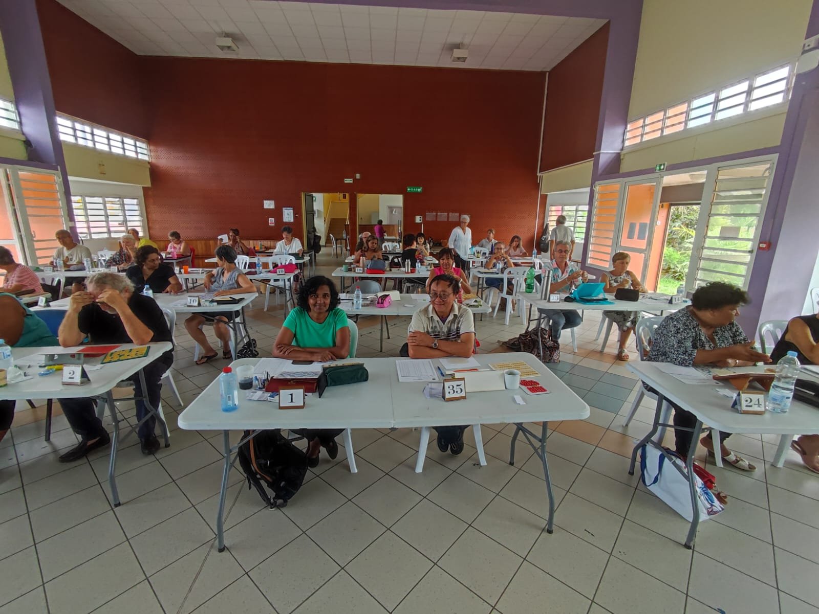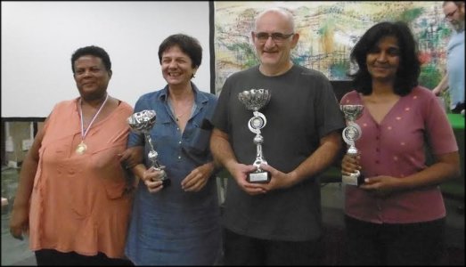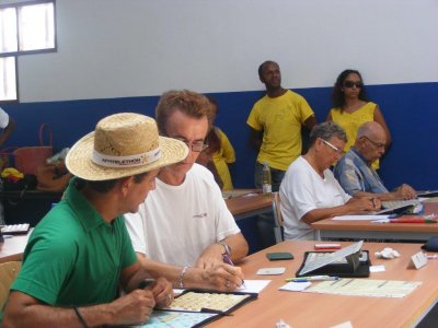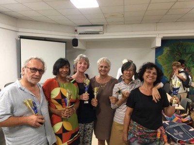 Réunion, apogée de la saison Scrabblesque locale. Le samedi, en 2 parties tirées par Bernadette Ollivier, secrétaire de la Ligue : Championnats de la Réunion par paires Les championnes sont (au centre) France Line Néoclés et Monique Atchy, indiscutablement les 2 meilleures joueuses de l’île. Belle 2e place des Saint-Pauloises Marie-Claire Mallard et Myrianne Séverin-Rancé (à gauche) 3ème, l’indissociable paire Tamponnaise : France Boulanger et Jean-Claude Guillot. 2 atscafiens participant mais pas de vraie paire "Atscaf" pour ce tournoi ! |