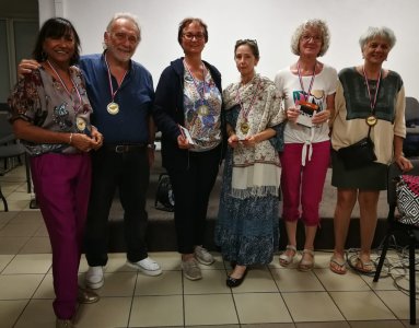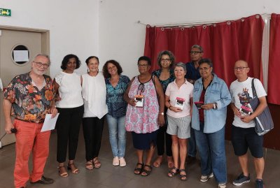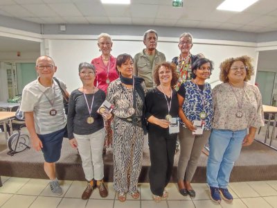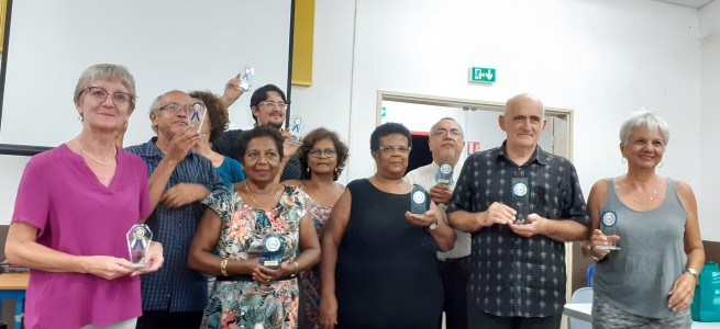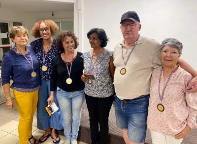 | Le podium (3 premières) , le premier série 3, la première série 4, la première série 5 et le premier série 6 entourés de Suzelle Boucher première adjointe à la mairie de St Paul et Jean-Luc Champenois responsable du club de St Paul et nouveau président de la ligue de scrabble de la Réunion. | (le podium Eve Baquer première) |