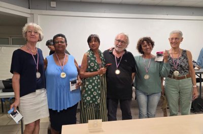 | L'ATSCAF a participé au tournoi de Aix les Bains joué en simultané à Saint Denis de la Réunion ... Localement Gérard HUSS et Jacqueline VILPONT et Eve BACQUER (à gauche) se placent respectivement 1er et 4° et 2° et Eric GUIGNET 9° : soit 4 atscafiens dans les 10 premiers sur 50 joueurs ! |