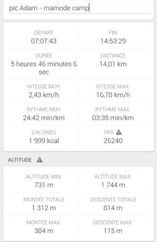 | 8 marcheurs au rdv à 6h30 sur le parking du tribunal de st Denis où nous attendait notre bus. Celui-ci nous a déposé à piton bois de nèfles juste devant l'entrée du sentier qui mène au pic Adam. Après 14kms de marche en 5h46 et quelques dénivelés nous avons rejoint mamode camp à 15h où nous avons retrouvé notre bus pour le retour vers St Denis. Temps humide, mais nous avons échappé à la pluie. Ambiance sympa et d'entraide dans les passages un peu acrobatiques. | |