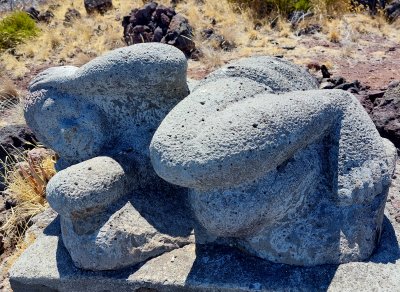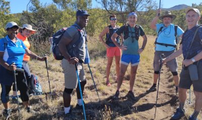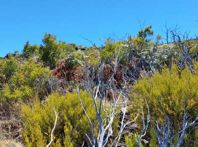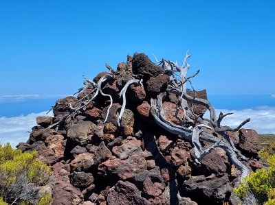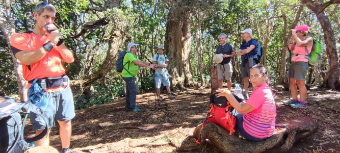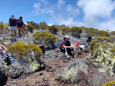 | 8 marcheurs étaient présents pour cette sortie dans les hauts de l'ouest ... Le minibus en a récupéré 5 à ste Clotilde et les 3 autres à St Paul Savannah pour déposer tout ce petit monde sur la route forestière au parking de départ de la randonnée Piton Rouge vers 8 heures. Vers 10h30 admiration des statues du sculpteur réunionnais Gilbert Clain (1941-2011) au sommet du Piton rouge puis la marche continue dans les cailloux jusqu'au Petit Bénare avec une pause à la caverne du roi Phaonce personnage mythique de l'histoire du marronage à la Réunion et enfin nous arrivons au sommet du Petit Bénare où le beau temps nous permet d'admirer le cirque de Cilaos et de faire la pause repas comme toujours bien conviviale ! Puis nous voilà repartis vers la route forestière des tamarins par le sentier "des tamarins" pour une arrivée au parking "Mario" à 16h30... Environ 13 km et un dénivelé de 800 m ! | |